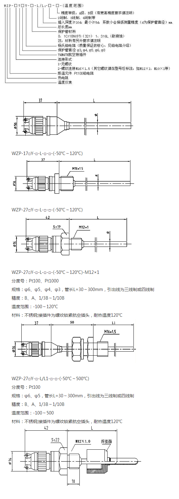外加焊接護(hù)套型WZPT-27□Y-□-L-□□-(-50~120℃)-M12×1